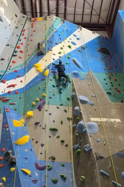 Member of Up Ending Parkinsons program climbing 60' wall.